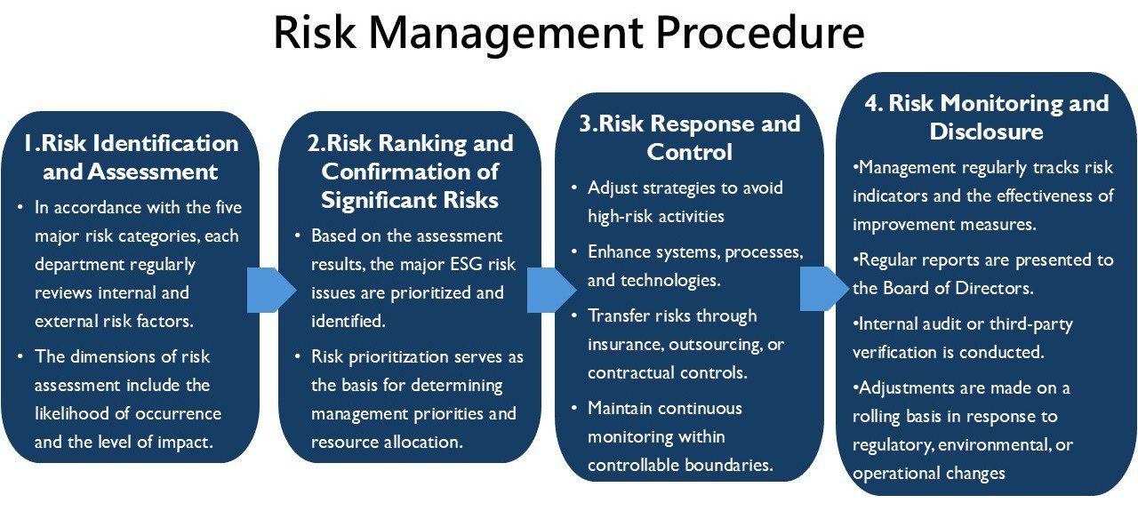 The Company follows procedures covering risk identification, risk analysis, risk assessment, risk response and monitoring, as well as risk reporting and disclosure, to formulate improvement strategies and control plans, and to supervise the execution of daily risk management activities by each functional unit.