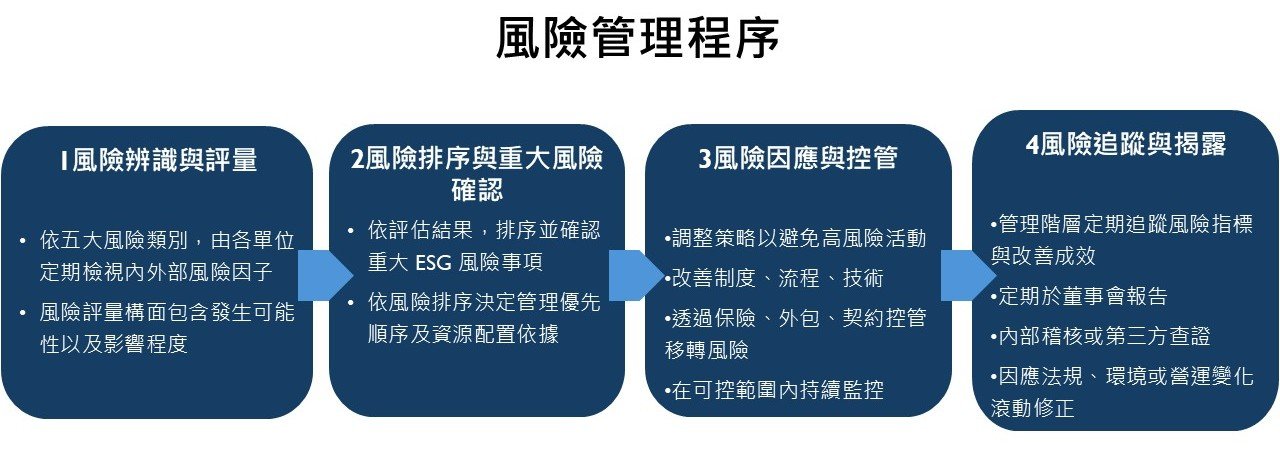 本公司於2025年10月30日經董事會通過訂定「風險管理政策與程序」,以確保本公司及所屬子公司實踐企業永續發展,遵循本公司管理體系及內部控制體系,管控營運過程所應考量之風險,並承諾藉由董事會層級參與及系統化管理,評估各風險對於公司營運的潛在衝擊,以落實公司治理、達成永續經營目標、保障利害關係人權利。